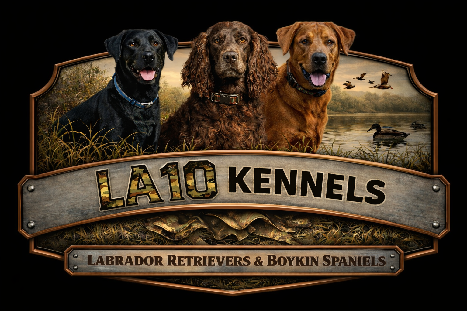 LA10 Kennels specializes in breeding exceptional Labrador Retrievers and Boykin Spaniels right here in Louisiana. Located in Franklinton, we raise proven sporting dogs known for their drive, intelligence, and versatility. Our dogs are bred with purpose—built to excel in the field, loyal to the family, and driven by the natural instincts that make them elite hunting companions. With a focus on strong bloodlines, excellent temperaments, and trainable minds, we are committed to producing healthy, high-quality dogs with true working ability. We also offer started hunting dogs and field trial prospects with solid training foundations for those ready to take the next step. Whether you're looking for a dedicated hunting partner or a dependable family companion, LA10 Kennels is proud to raise top-quality sporting dogs built for both performance and home.